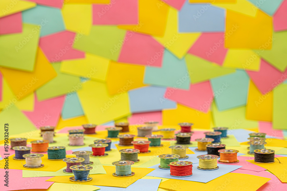 metal spools with Multicolored thread for sewing machine on a table with multicolored paper sticky notes on background