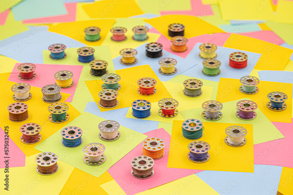 metal spools with Multicolored thread for sewing machine on a table with multicolored paper sticky notes on background
