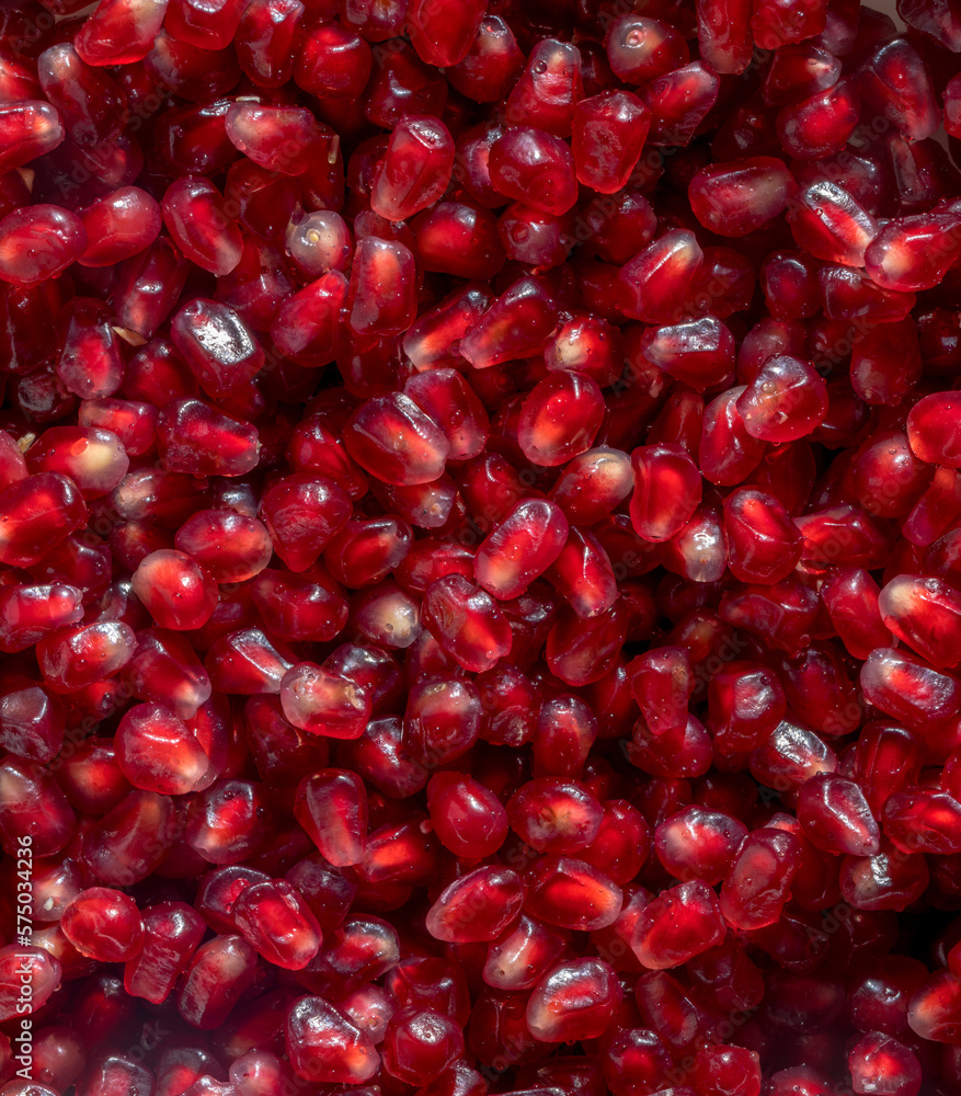 Pomegranate seeds with water droplets glisten in the light. Solid texture of pomegranate seeds. Closeup.