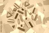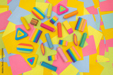 various shapes and colors of erasers arranged on a table with multicolored paper sticky notes on background