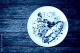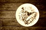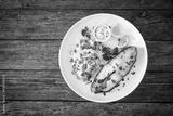 Fish dish - fried halibut with white rice, peas and carrots on wooden table