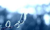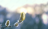 Spring fluffy willow buds close up. pussy willow branch on sunny light natural blurred background. Spring season symbol. template for design