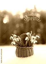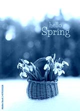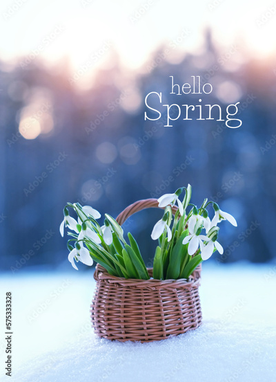 Hello Spring greeting card. snowdrops flowers in wicker basket on snow, abstract natural background. snowdrops - symbol of early spring season, gentle floral nature image