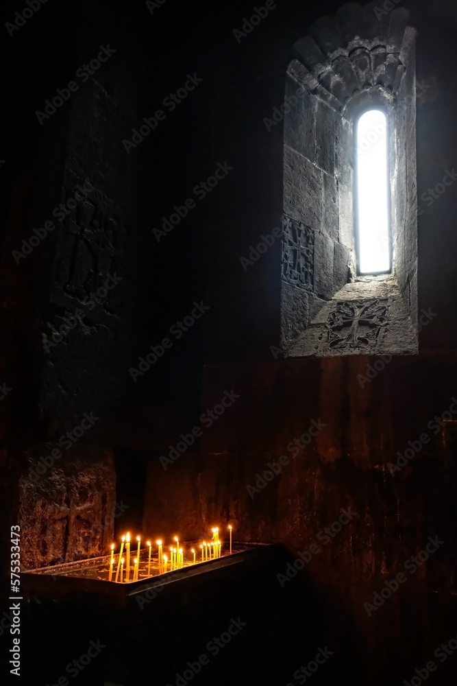 Interior of ancient church. burning candles on candlestick in old stone monastery, dark blurred abstract background. Religious, mourning concept. symbol of Lent, Faith in God, Prayer.