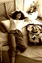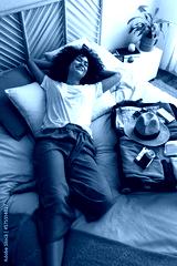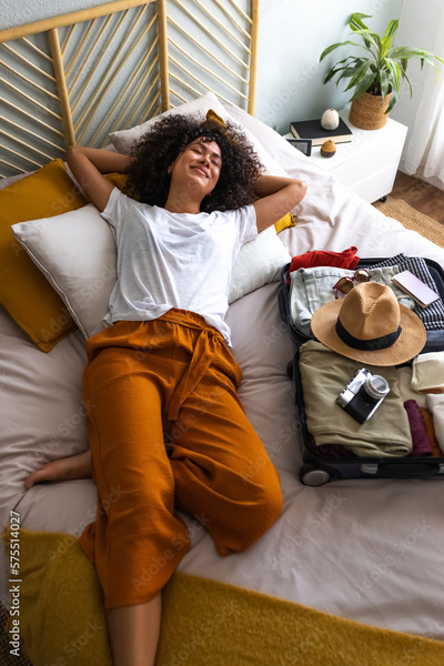 Woman lying down on bed next to open suitcase full of clothes, camera ready to go on summer vacation trip. Vertical.