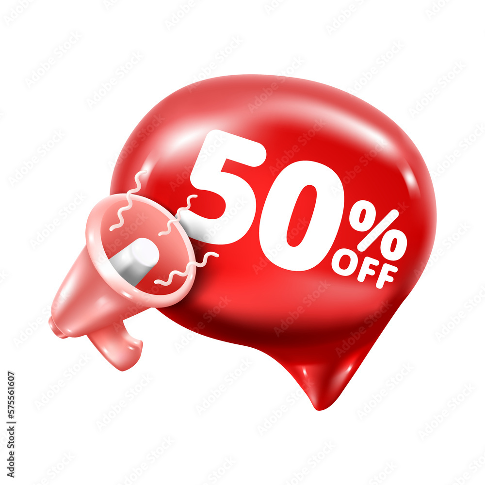 3d speech bubbles tags and megaphone with discount off 50 percent.