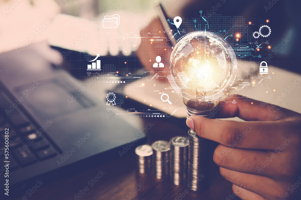 Hand businessman choose light bulb with business marketing strategy icons concept goal to growth of creative financial planning idea and startup strategic plan investment management or personal loan.