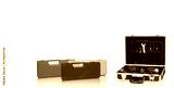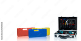 Toolbox isolated on white background. Toolbox with tools. Pliers, spanner or wrench, screwdriver, cutter, and cordless driver drill in tool case. Mechanic hand tools. Blue, orange, and yellow toolbox.