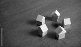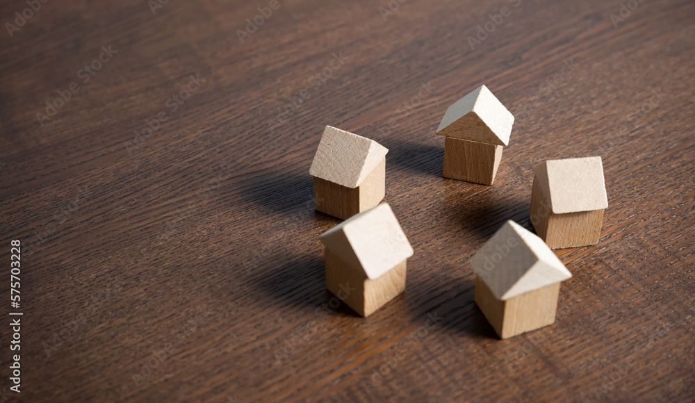 Circle of houses figures. Community of homeowners. Housing and real estate. Residents co-op. Investments and construction. Mortgage. Realtor services.