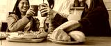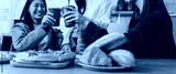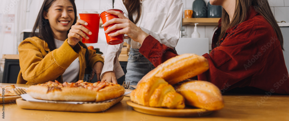 Young woman eating pizza and laughing while sitting with her friends in a restaurant. Group of friends enjoying while having food and drinks at cafe.