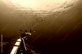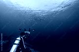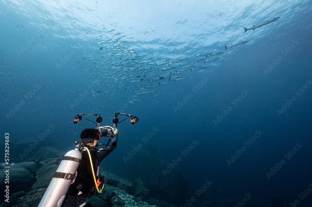 Male scuba diver taking a photo school of Barracuda fish in the blue ocean. Underwater photography concept