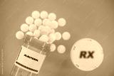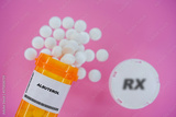 Albuterol Rx medicine pills in plactic vial with tablets. Pills spilling from yellow container on pink background.