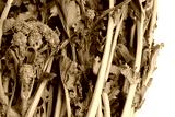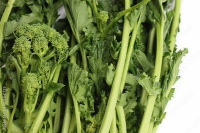 Fresh green turnip plants. Italian cime di rapa with green leaves and blossoms on white background. Brassica rapa var. cymosa
