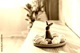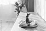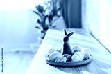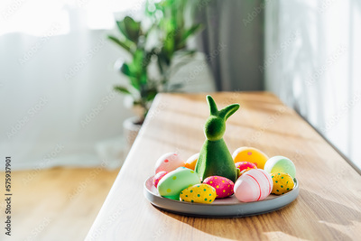 Easter home decor. Green bunny rabbit figurine and colored easter chocolate eggs on plate on wooden console with green home plants and sunlight and shadows on white wall. Selective focus. Copy space.