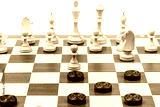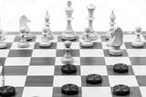 playing by different rules on the same board - black checkers and white chess figures on wooden chessboard, chess and checkers gaming (focus on checkers disc in center)