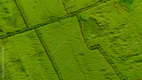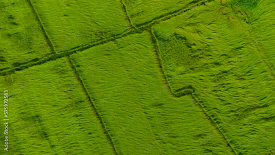Aerial view of green rice field texture background. Rice plants bend down to cover ground from monsoon winds. Natural pattern of green rice farm. Above view of agricultural field. Beauty in nature.