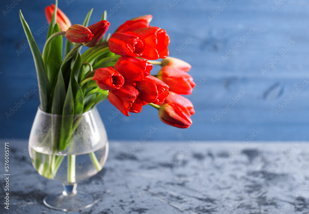Red blooming tulips in a vase on a blue background with copy space. International Women's Day concept postcard