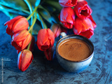 A bouquet of tulips and a cup of coffee, breakfast on International Women's Day