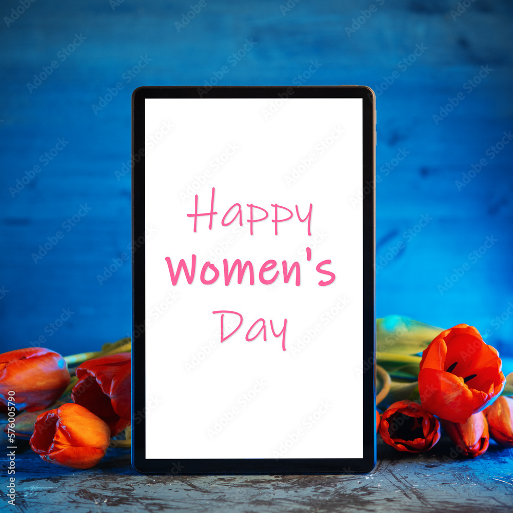 Happy women's day congratulations on the tablet, a bouquet of red tulips, blue background