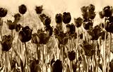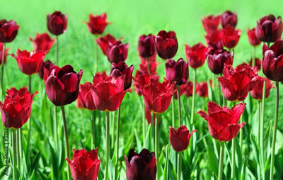 red-purple Tulips in garden, abstract blurred natural background. blossoming tulip flowers, symbol of spring season. floral landscape. template for design