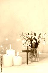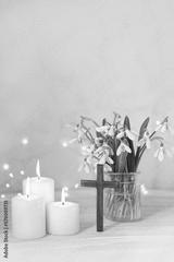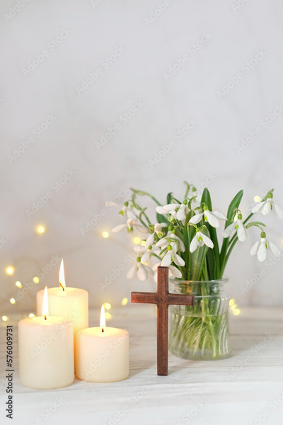 Wooden cross, snowdrops flowers and candles on table, blurred abstract background. Religious church holiday. symbol of faith in God, Christianity Feast, Easter, Palm Sunday, Lent