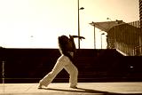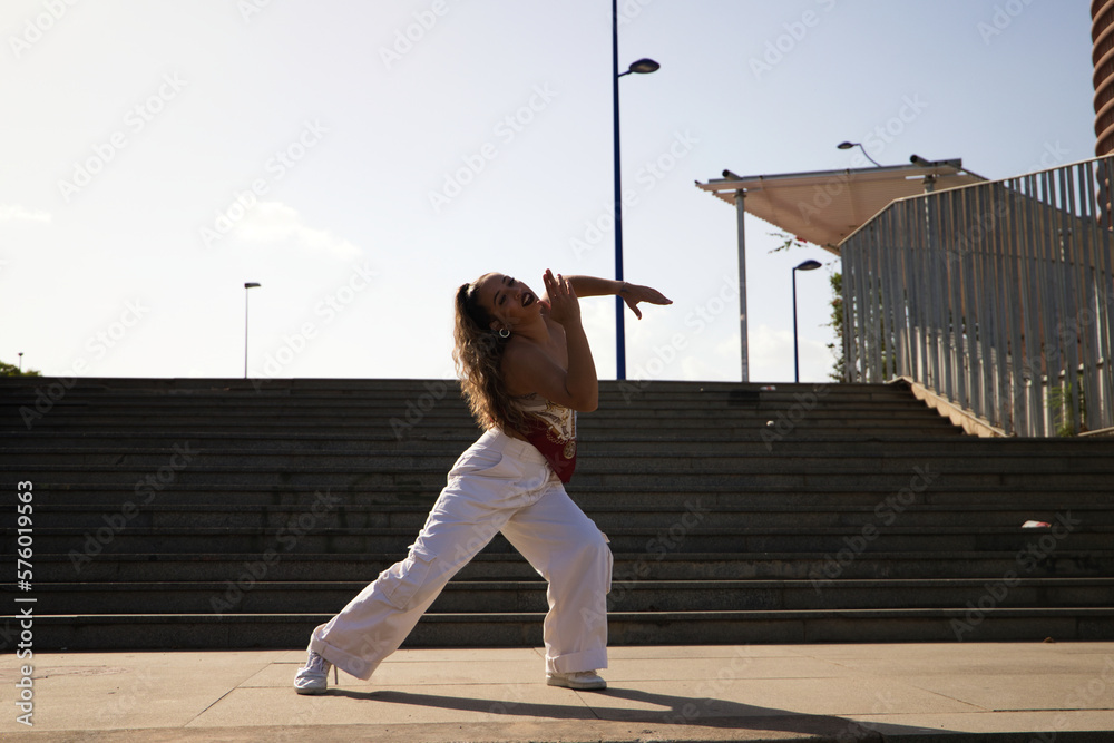 Latin woman, young and beautiful dancing modern dance in the street and makes different expressions and postures. Concept dance, hip hop, dance, art, action, beauty, youth art.
