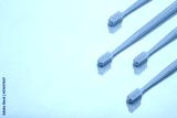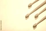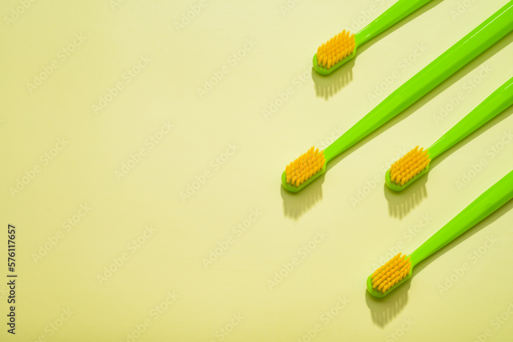 Modern green kids toothbrushes on a yellow background. Copy space for your text,