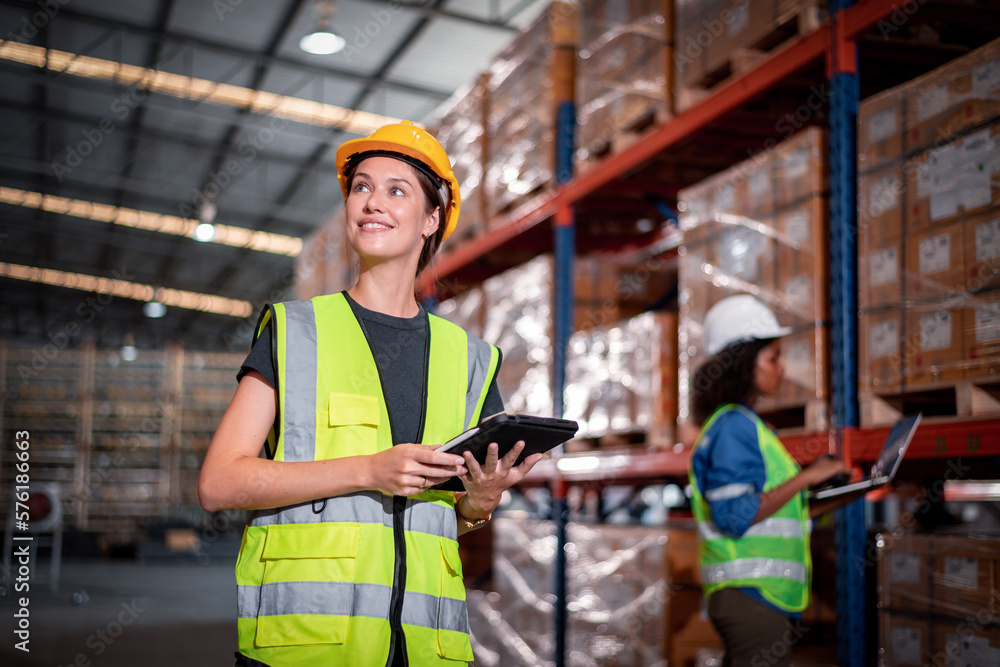 Industry warehouse worker in helmets with order details and checking goods supplies on boxes shelve in workplace warehouse industry logistic export import distribution business concept