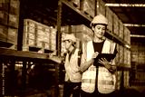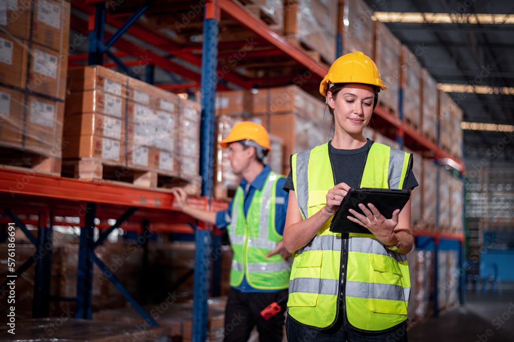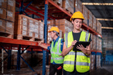 Industry warehouse worker in helmets with order details and checking goods supplies on boxes shelve in workplace warehouse industry logistic export import distribution business concept