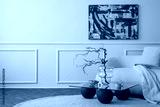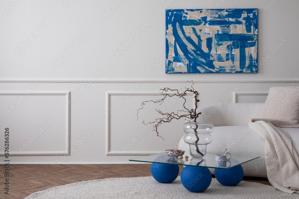 Modern composition of living room interior with copy space, mock up poster frame, stylish sofa, glass coffee table, beige pillow, bowl with nuts, round rug and accessories. Home decor Template