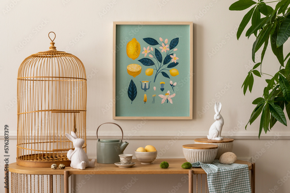 Cozy composition of easter living room interior with mock up poster frame, wooden sideboard, easter bunny, stylish bowl, wooden cage, colorful easter eggs and personal accessories. Home decor Template