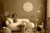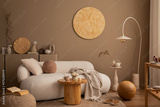 Interior design of cozy living room with wooden wall panel, stylish sofa, round coffee table, braided pouf, brown sideboard, vase with branch, beige lamp and personal accessories. Home decor. Template