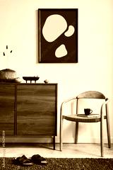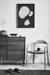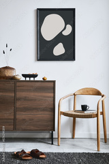Stylish living room interior composition with mock up poster frame, brown wooden commode, armchair and small home decorations. White wall. Copy space. Template. .