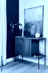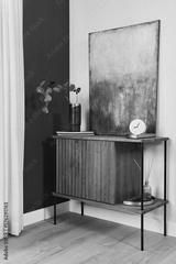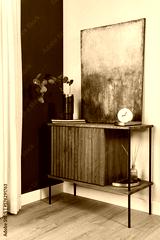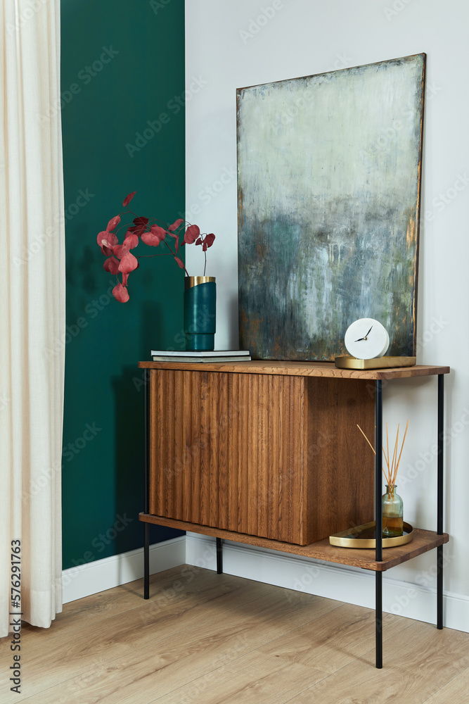 Elegant details of modern gramour interior design with wooden sideboard, painting and stylish personal accessories. Template.