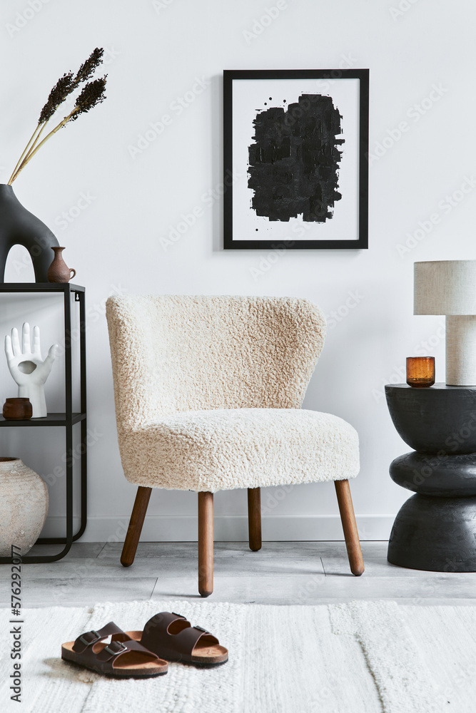 Stylish interior design composition of living room with mock up poster frame, fluffy armchair, coffee table, commode and personal accessories. Modern classic style. Template.