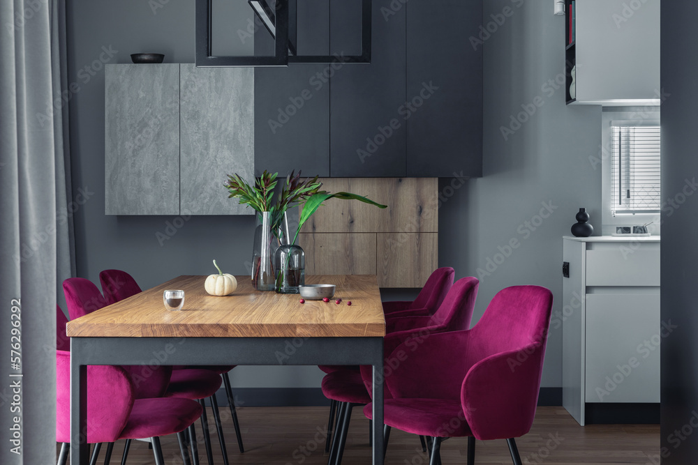 Elegant dining room interior composition with velvet chairs, design wooden table, lamps and beautiful personal accessories. Open space. Concrete walls. Modern home decor. Template.