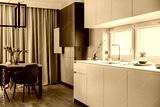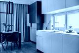 Stylish composition of kitchen and dining room open space interior. Minimalist ergonomic kitchen space. Velvet chairs, wooden table and personal accessories in the modern dining room. Template.
