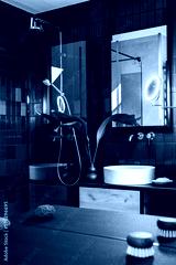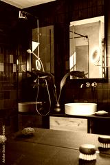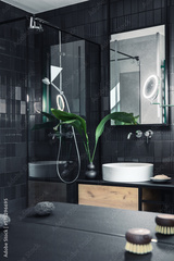 Stylish bathroom interior with shower, sink and personal bathroom accessories. Modern and creative interior concept. Black walls. Template.