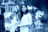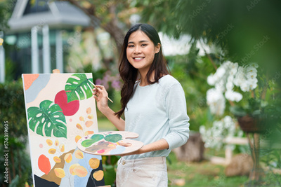 Young asian woman artist painting on canvas..Female artist drawing with inspiration in garden.