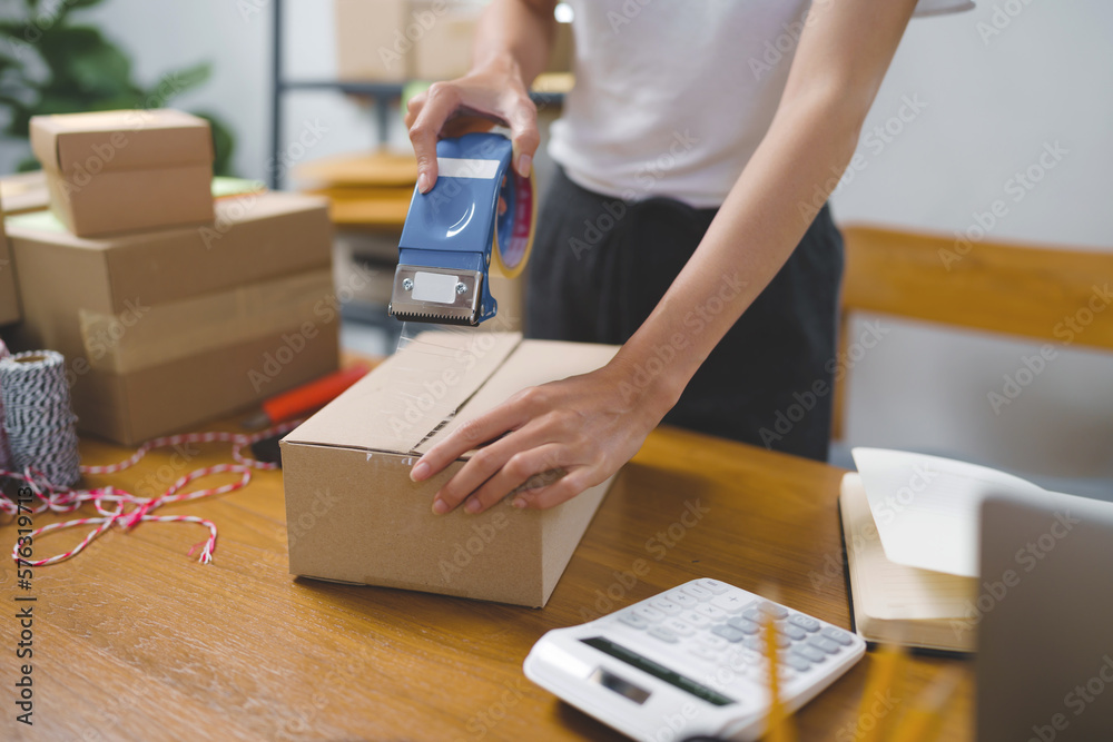 Business owner entrepreneur packing cardboard box preparing parcel for shipment, Online marketing.