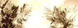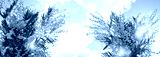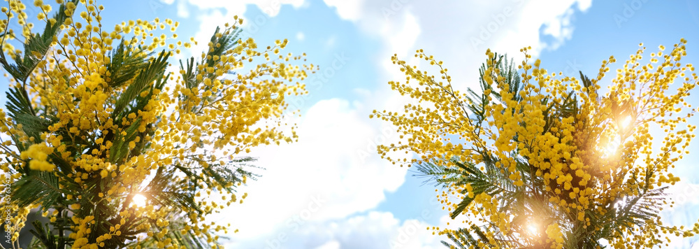 Mimosa flowers close up against abstract blurred blue sky background. symbol of festive Spring season, 8 March holiday. fluffy yellow buds mimosa texture. Template for design. banner. copy space