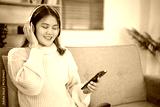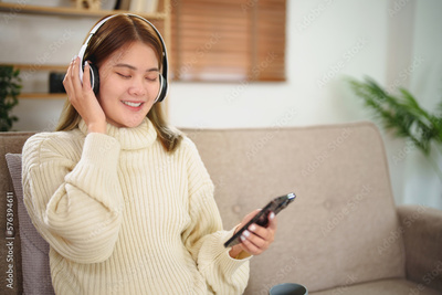 Young asian woman with headphones relaxing at home. listening to music. sitting on cozy sofa wearing headphone
