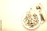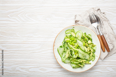 Healthy vegan green avocado salad bowl with sliced cucumbers, edamame beans, olive oil and herbs on ceramic plate top view on white wooden rustic table background. Space for text