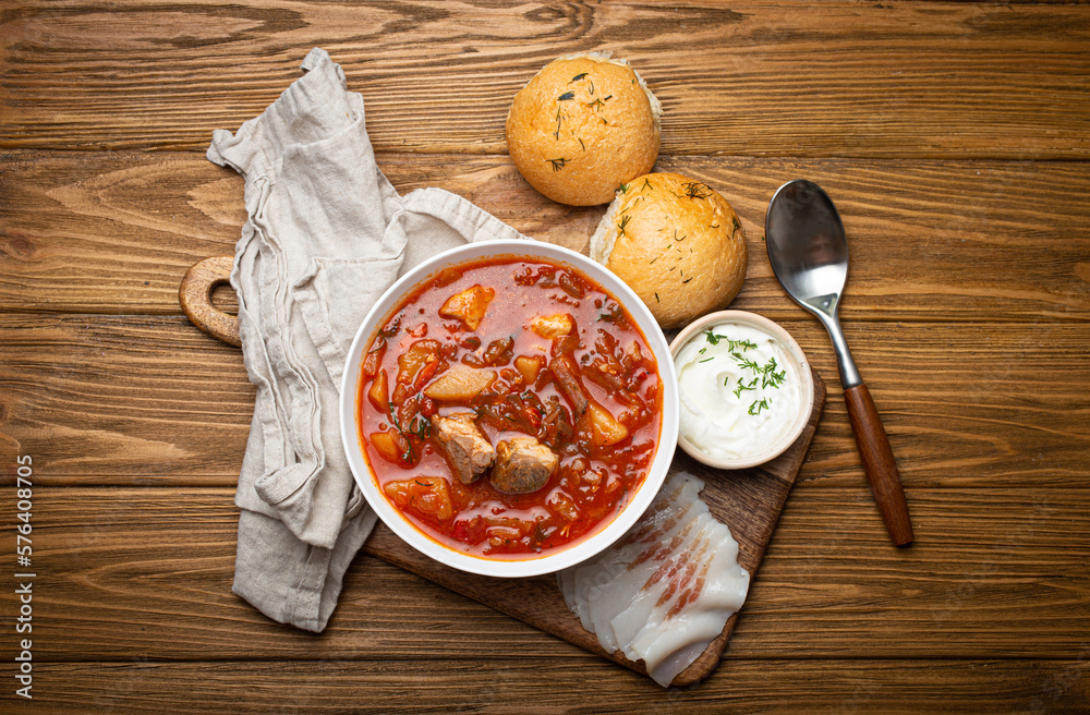 Ukrainian Borscht, red beetroot soup with meat, in white bowl with sour cream, garlic buns Pampushka and salo slices on rustic stone background. Traditional authentic dish of Ukraine