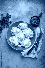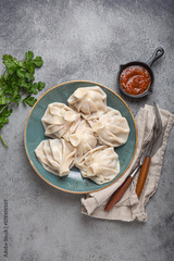 Georgian dumplings Khinkali on plate with red tomato sauce and fresh cilantro top view on rustic stone background, traditional dish of Georgia