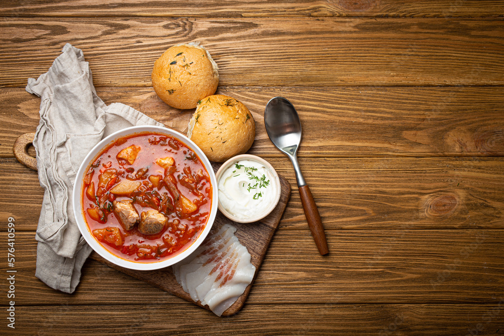 Ukrainian Borscht, red beetroot soup with meat, in white bowl with sour cream, garlic buns Pampushka and salo slices on rustic stone background. Traditional authentic dish of Ukraine, space for text