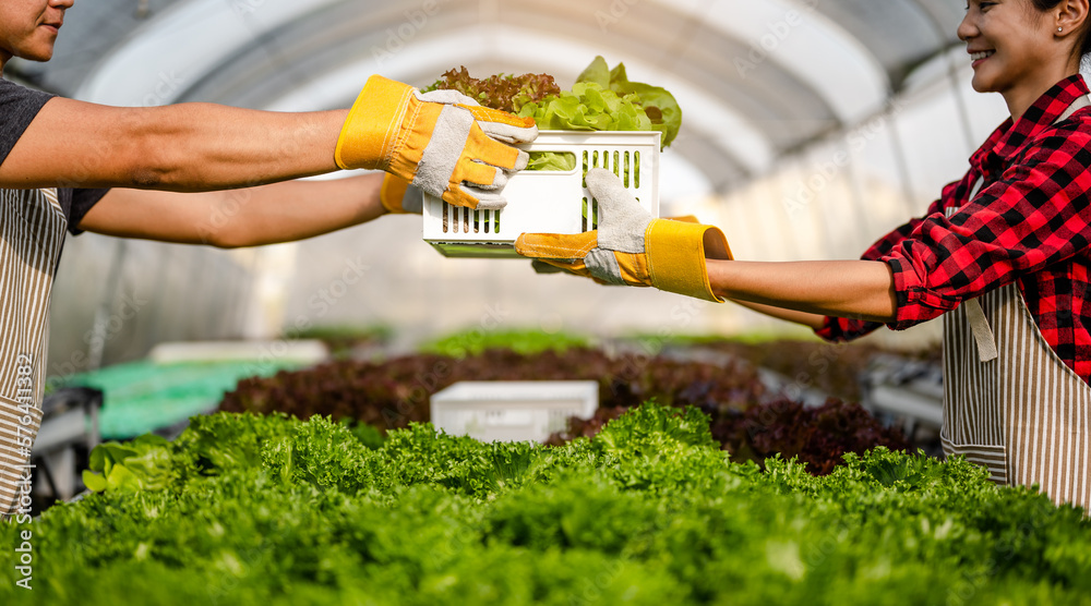 The gardener harvesting lettuce a vegetable growing house in morning.Farmers are picking lettuce to sell. Agriculture, gardener, farm, harvest, vegetable, technology concepts.