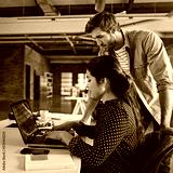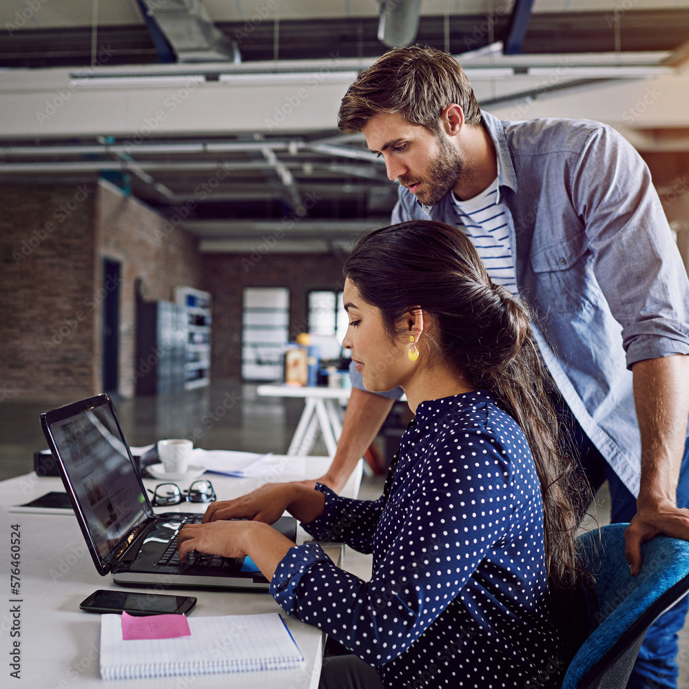 Team, laptop and web designer at startup with collaboration, typing and webdesign, work together and digital marketing. Meeting, man and woman at modern office with partnership, strategy and internet