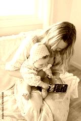 baby with limb difference disability sitting in mom's lap looking at a phone