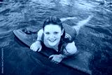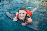 teenage girl with freckles and wet hair in red bathing suit in a pool during the summer